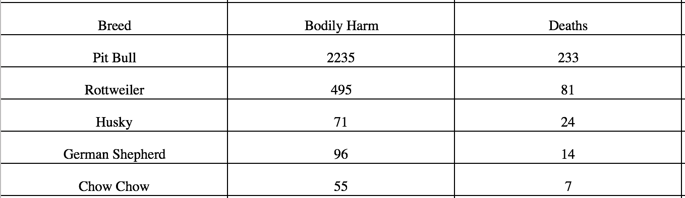 As you can see from the table below, the top five most dangerous dog breeds are dogs that are bigger.